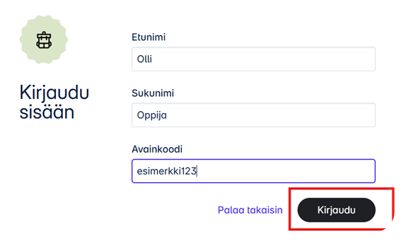 -> Kirjautumisikkunaan syötetään oppilaan etunimi, sukunimi ja henkilökohtainen avainkoodi. Tietojen syöttämisen jälkeen napautetaan Kirjaudu.