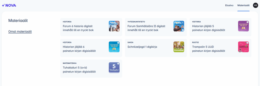 - Materiaalin lisäämisen jälkeen oppilas näkee Novan etusivulla maksimissaan kolme viimeksi käyttämäänsä materiaalia. Muutoin materiaalit löytyvät Novan Materiaalit-välilehdeltä.
