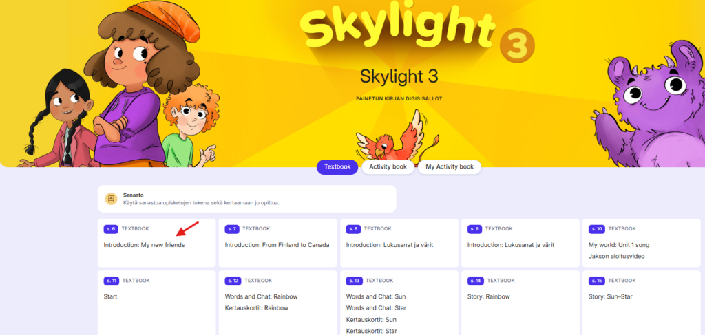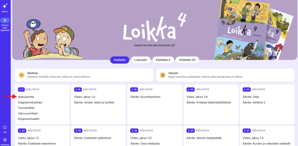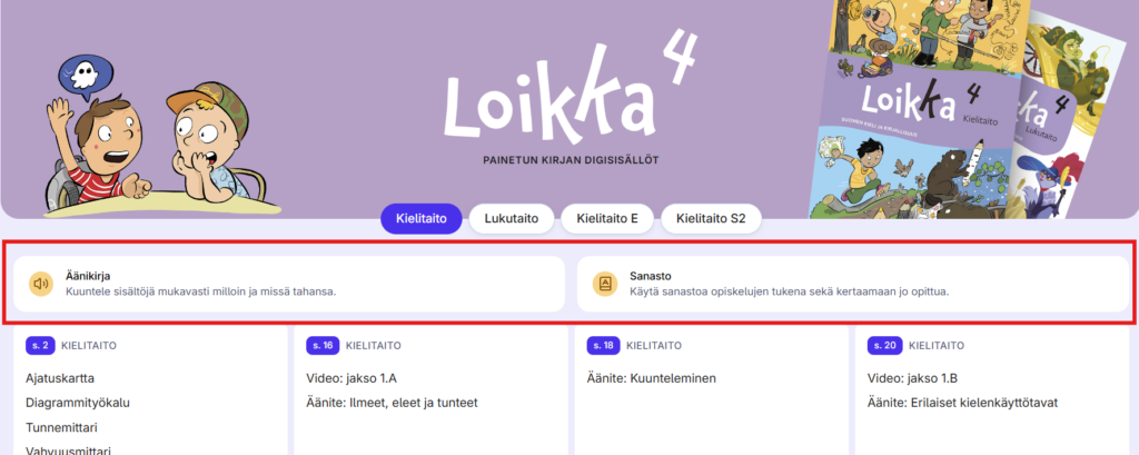 - Kielten painettujen kirjojen digisisällöissä ei ole äänikirjaa, vaan tehtävien äänet ja muut äänitteet löytyvät sivunumeron perusteella materiaalin perusvalikosta.