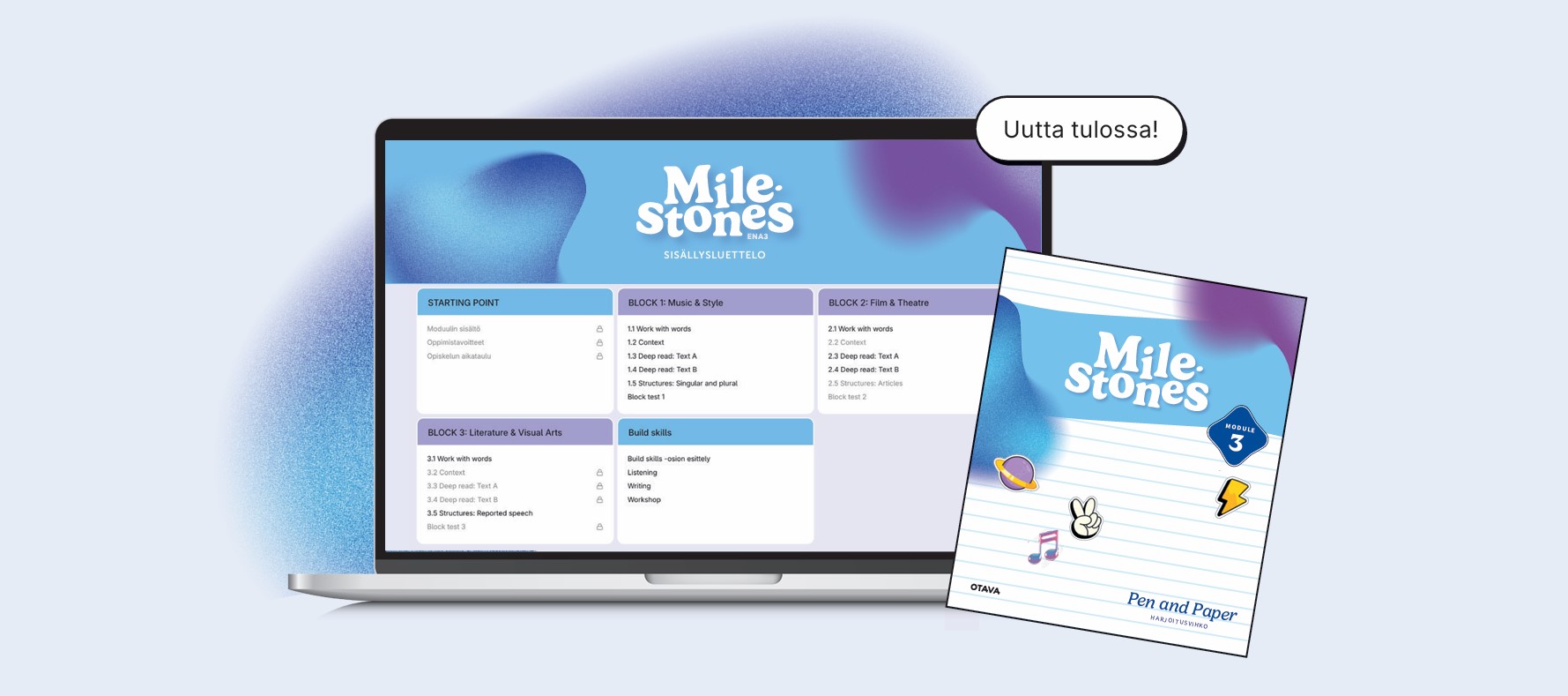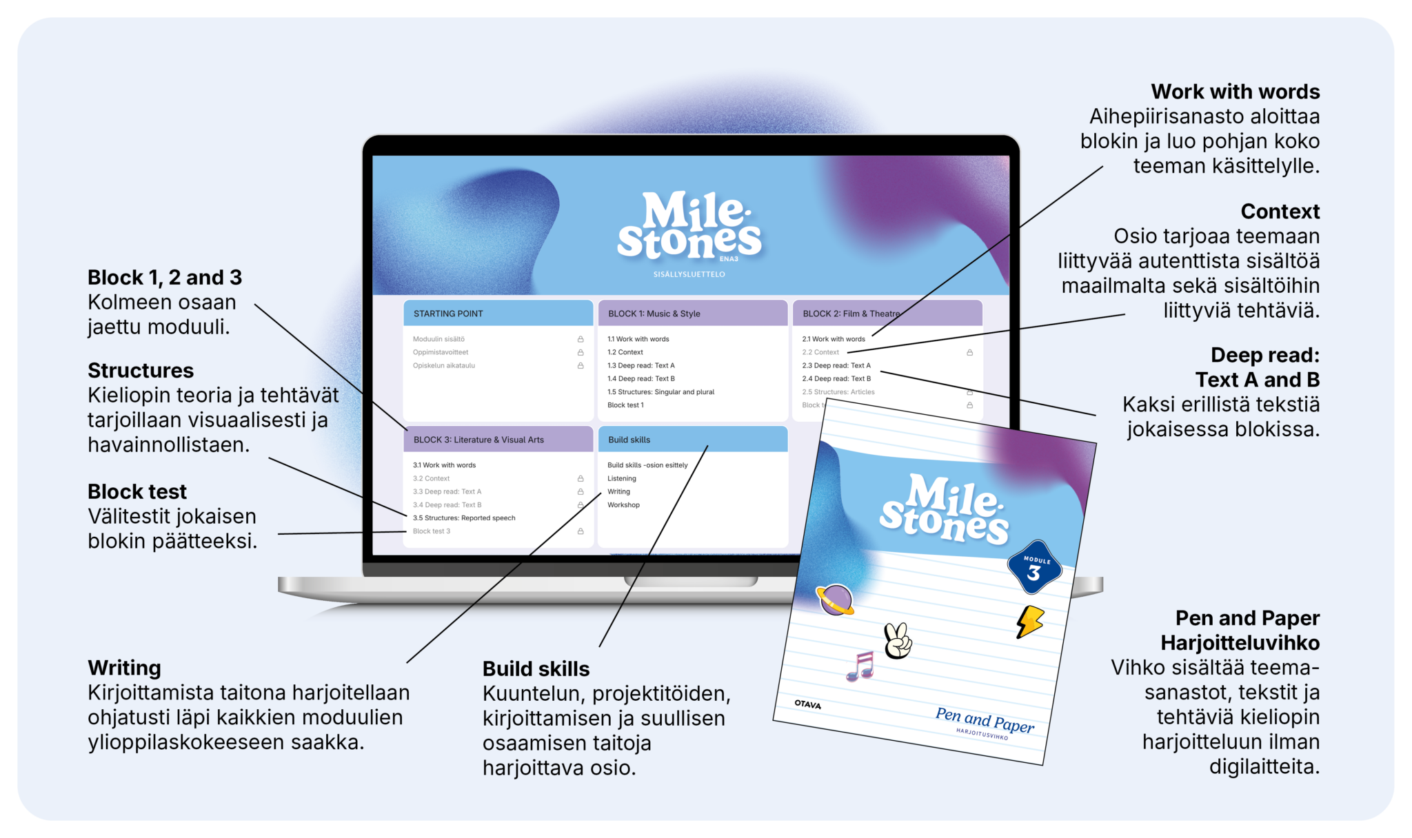 Rytmitetty rakenne, väliarvioinnit ja monitasoiset tehtävät tukevat opetuksen suunnittelua ja mahdollistavat omantasoisen harjoittelun jokaiselle oppijalle. Milestones syntyy yhteistyössä lukiokentän opettajien kanssa.
